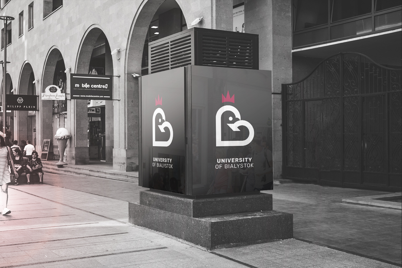 Projekt konkursowy (niezrealizowany). Celem projektu było stworzenie unikalnego znaku do celów marketingowych dla Uniwersytetu. Starałam się unikać oczywistych skojarzeń związanych z rejonem Podlasia (żubr, las). Jednocześnie odwołałam się do emocji (serce) jako podstawowej wartości marketingowej.